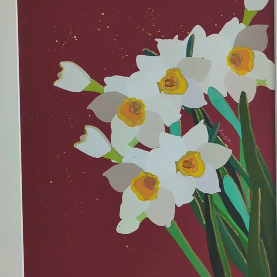 Set against a deep red background reminiscent of Lunar New Year festivities, this lush cluster of white daffodils—with vibrant golden-yellow centers and flowing green foliage—evokes prosperity, purity, and fresh beginnings. Each hand-applied stroke of gold ink enhances the flower's soft structure, giving the entire piece a feeling of ceremonial elegance and timeless charm.