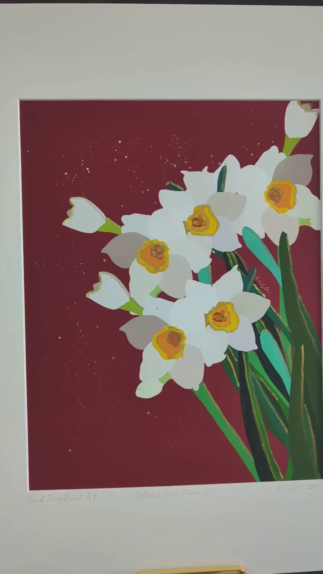 Celebrate abundance, renewal, and quiet radiance with this one-of-a-kind edition of Daffodils 2, delicately hand-embellished with gold ink. This version elevates the original composition with glimmering gold accents that catch and reflect the light—drawing out the daffodils’ joyful symbolism and adding dimension to their graceful forms.